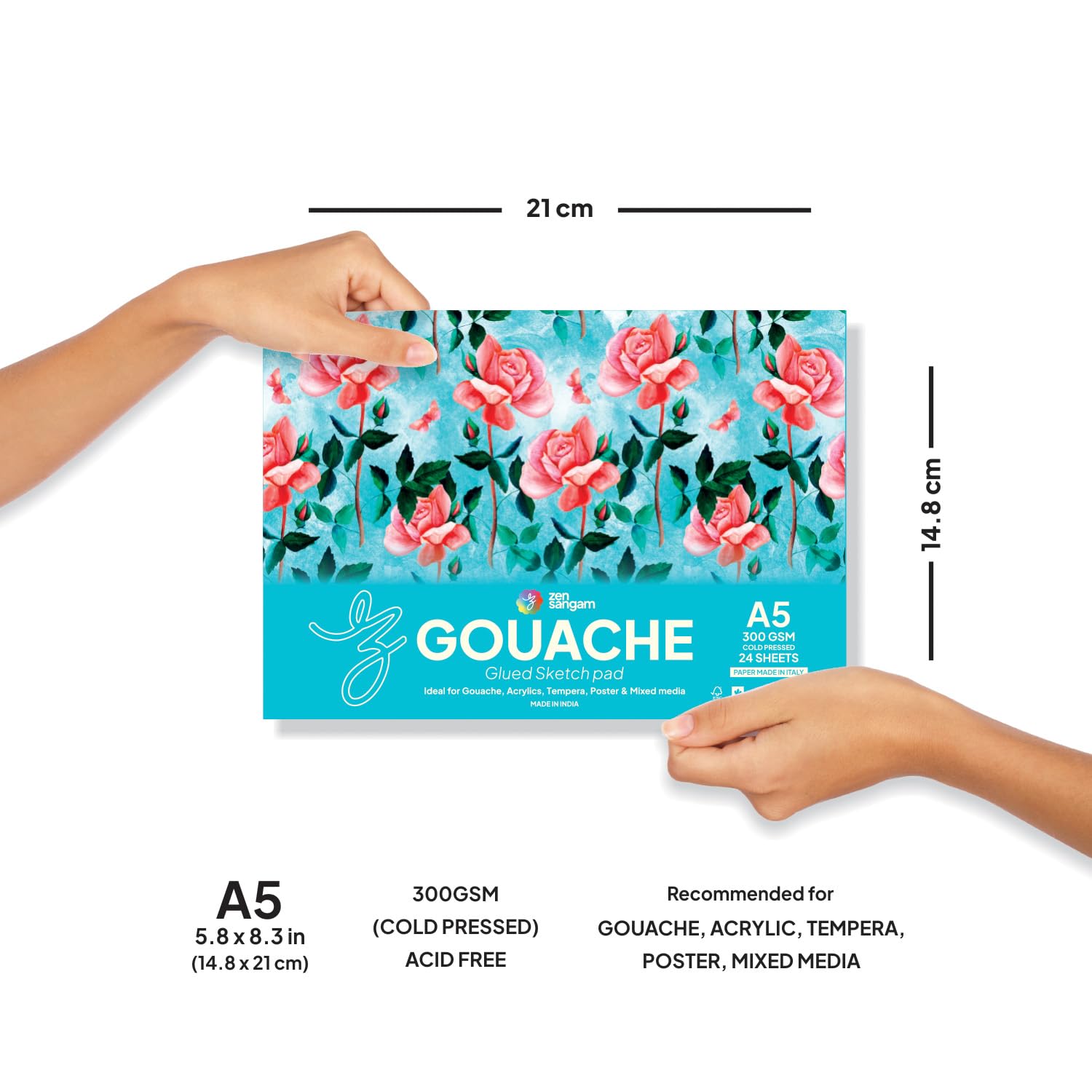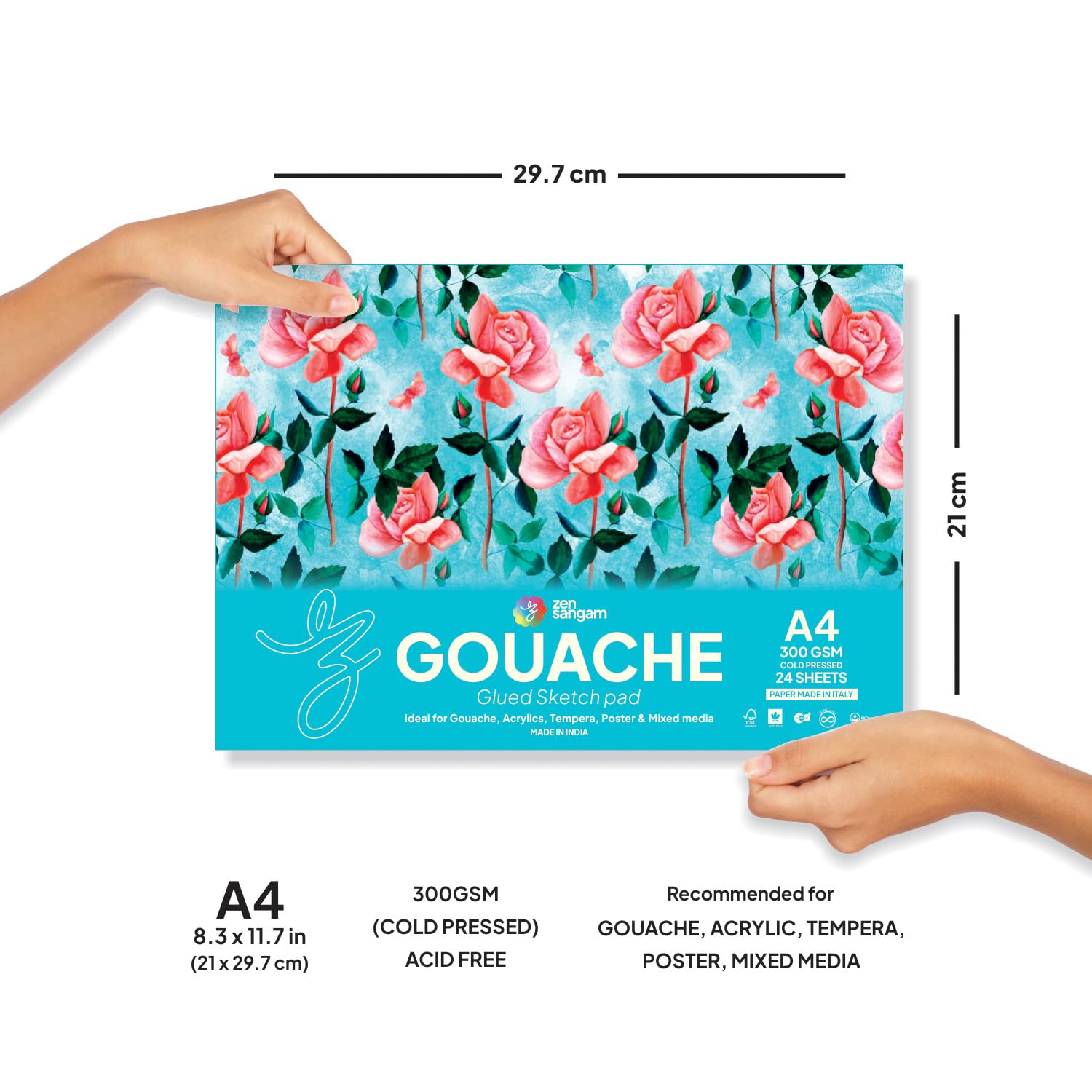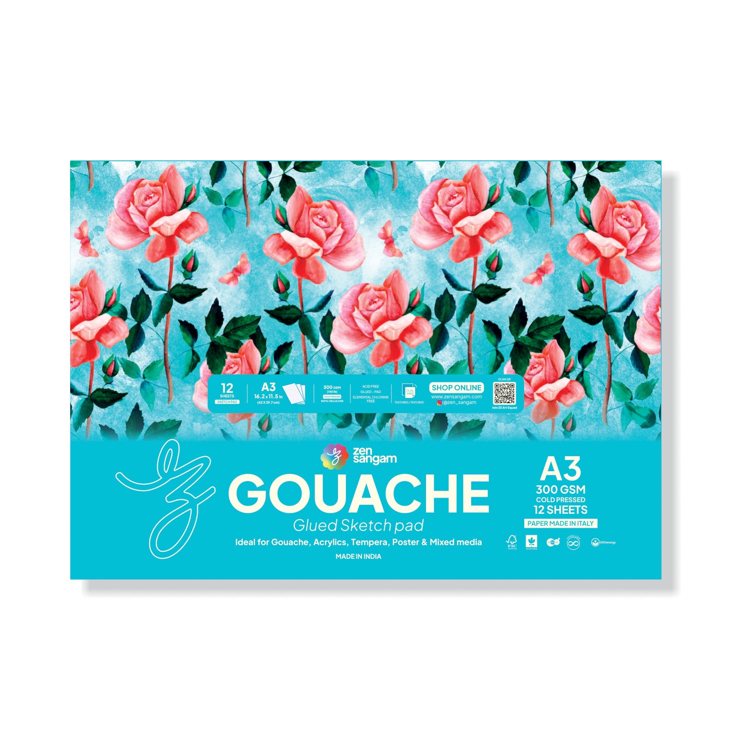 - A Gouache Glued Sketchpad with 24 Sheets of 300 GSM Cold Pressed Gouache Paper.